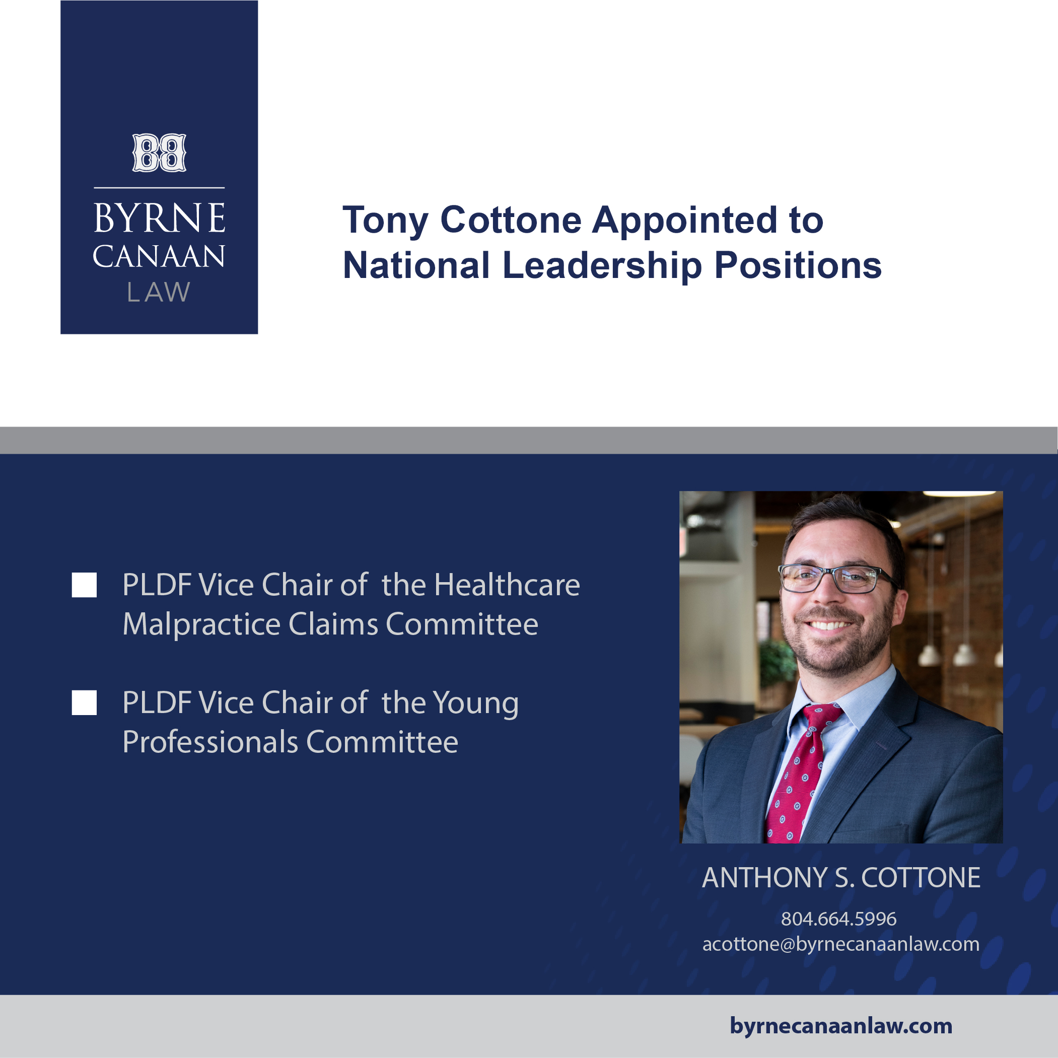 Tony Cottone has been an attorney at Byrne Canaan Law since its founding. He is a passionate litigator who specializes in all areas of health law, including medical malpractice suits, administrative investigations and hearings, and general liability litigation. Tony is truly dedicated to achieving the best results for his clients and counseling them through difficult times. About his promotion, Tony says, “I’m honored to be named Partner at Byrne Canaan Law and consider it a privilege to continue working with such a talented team, serving so many fantastic and deserving clients. Byrne Canaan Law is tremendously important to me, and I am excited for our future.” Byrne Canaan Law is thrilled to promote Tony to Partner in recognition of his hard work, dedication, and stellar achievements.
