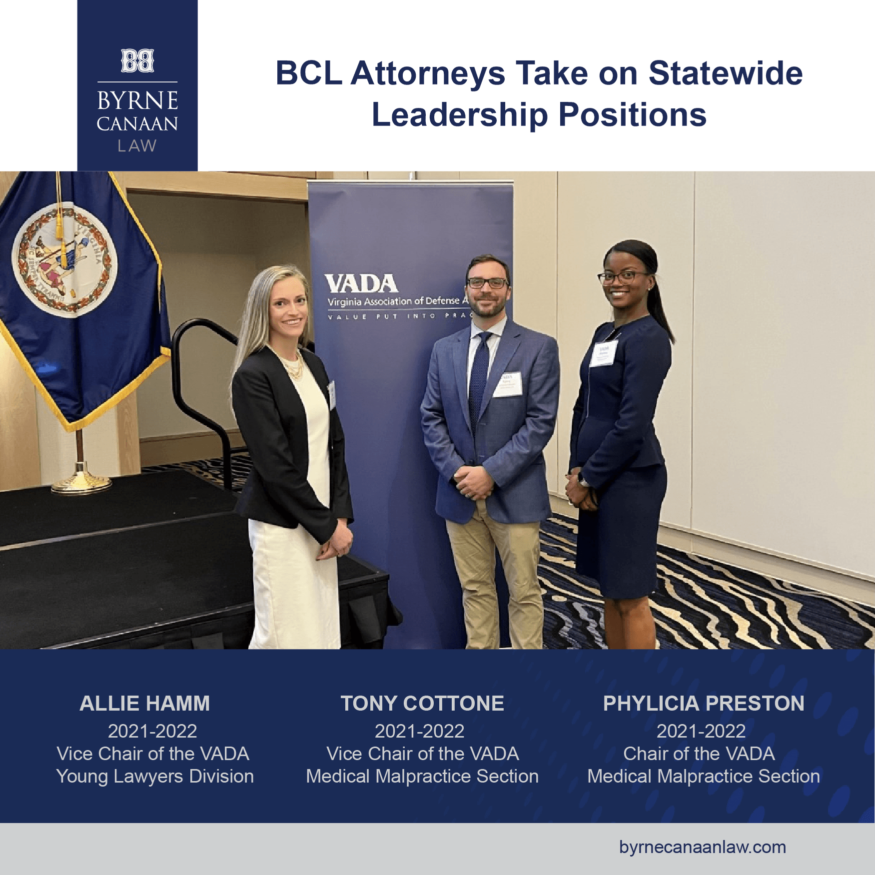 Attorneys Phylicia Preston, Tony Cottone, and Allie Hamm recently took over leadership positions in the Virginia Association of Defense Attorneys (VADA). VADA is a statewide bar association of over 850 civil defense attorneys. The organization provides professional, educational, and social programs to lawyers whose primary focus is the defense of parties in civil disputes. Phylicia, Tony, and Allie attended the 2021 Annual Meeting in Virginia Beach, where they assumed their new leadership roles.