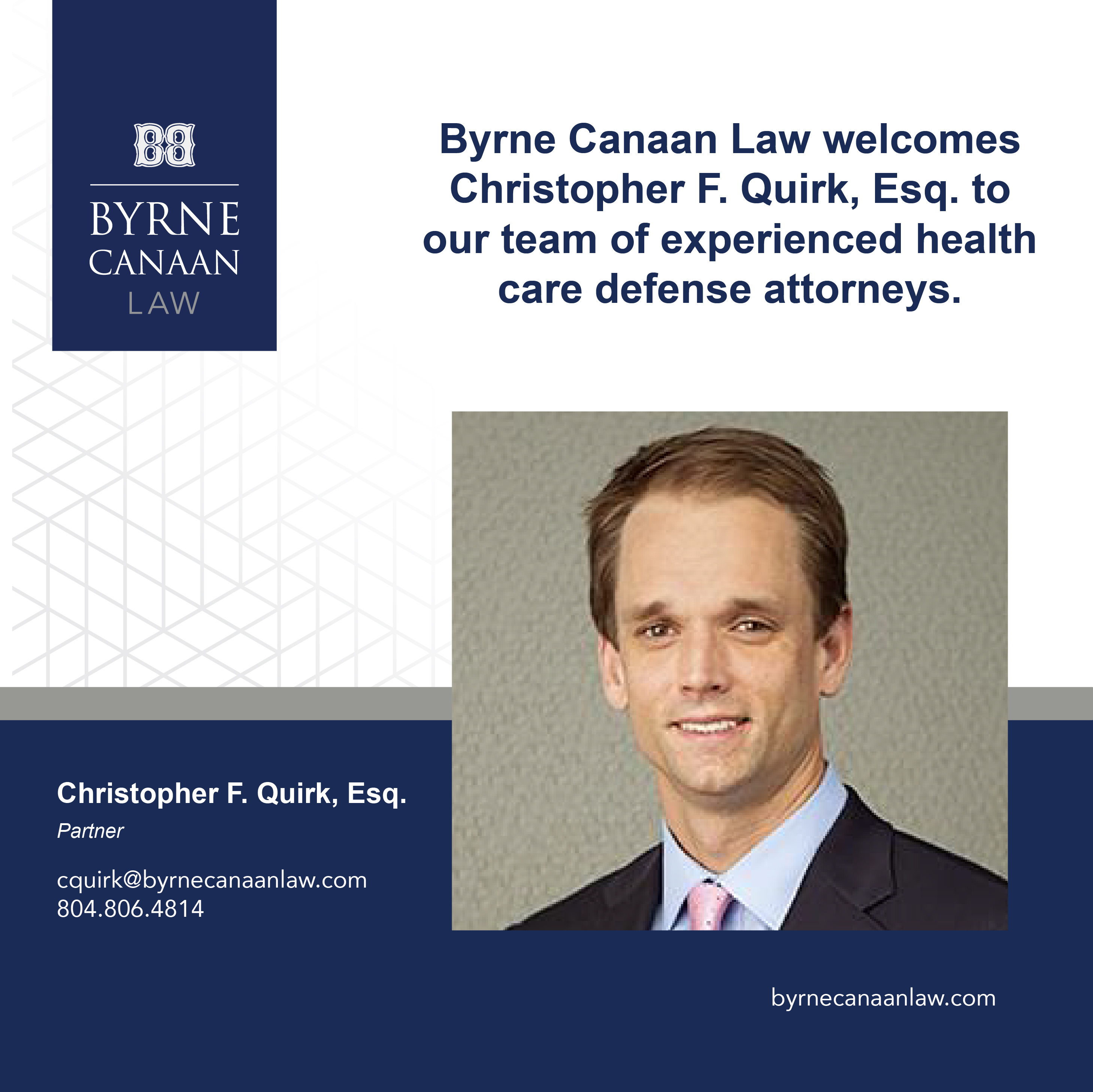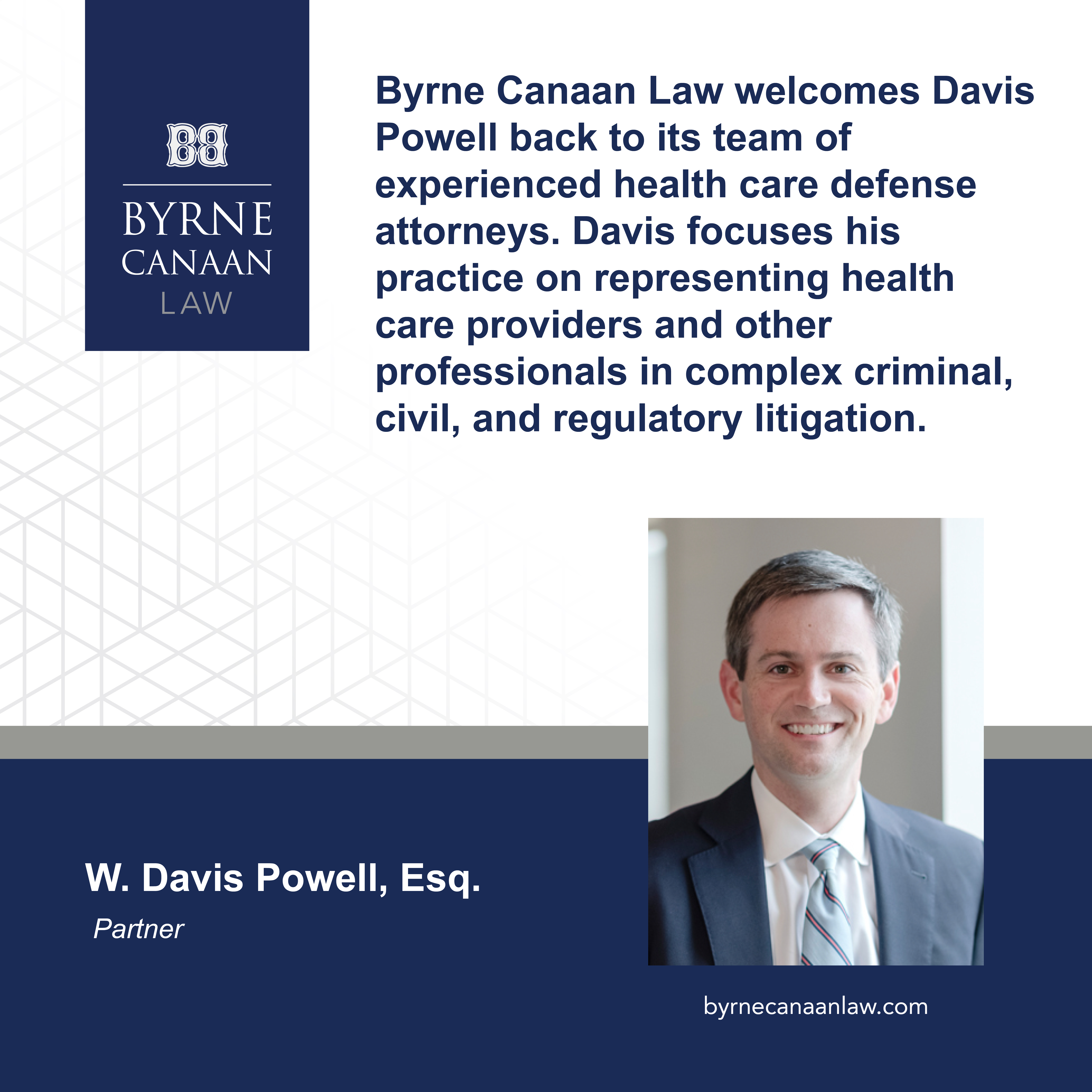 Byrne Legal Group is pleased to announce that attorney Davis Powell has been promoted to Partner. Davis focuses his practice on defending healthcare providers in complex civil and criminal litigation.