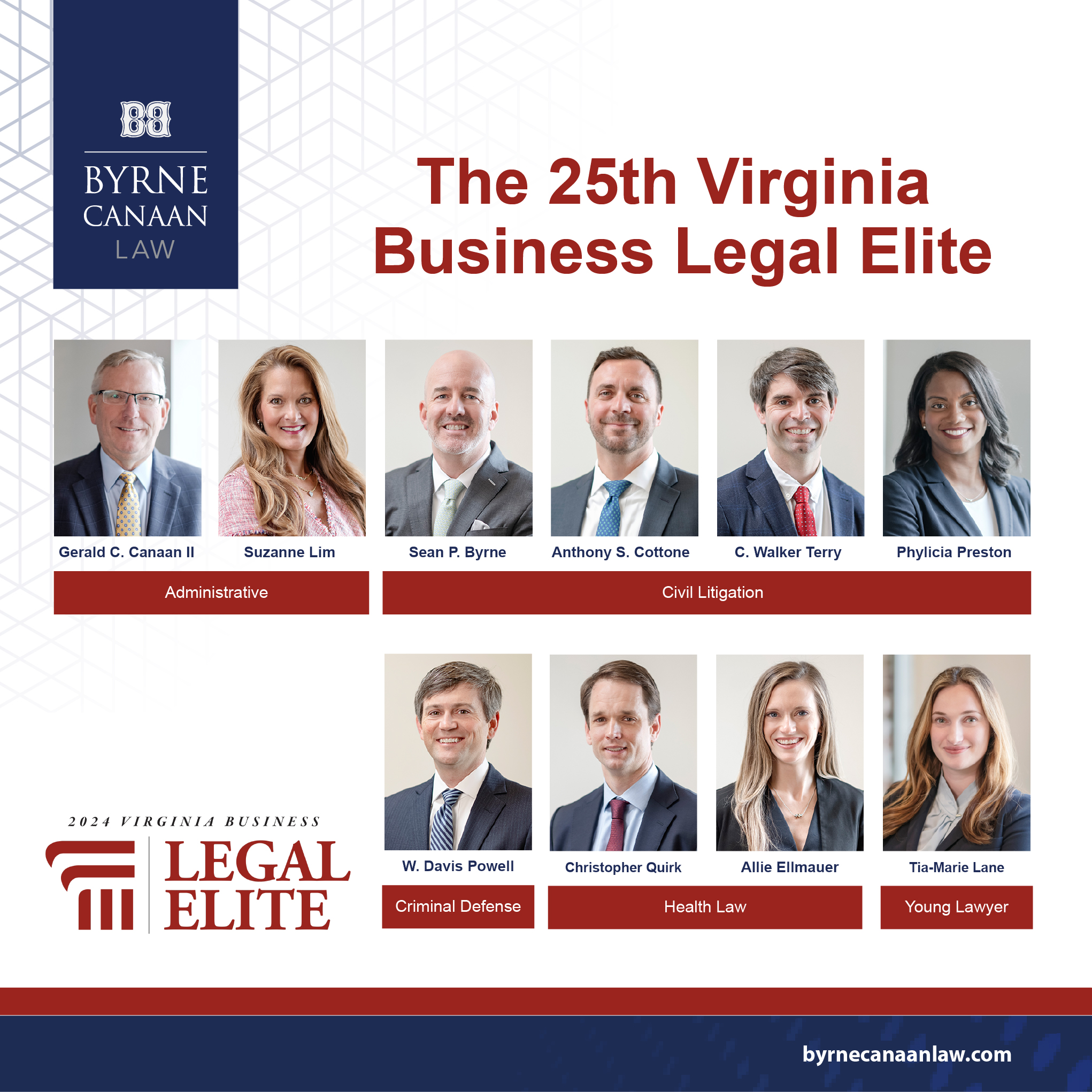 Virginia Business magazine released its 2021 Legal Elite ranking and featured six Byrne Canaan Law attorneys across various areas of law. Recognition on this list is a distinct honor, as it reflects the opinions and ratings of other attorneys across the Commonwealth.